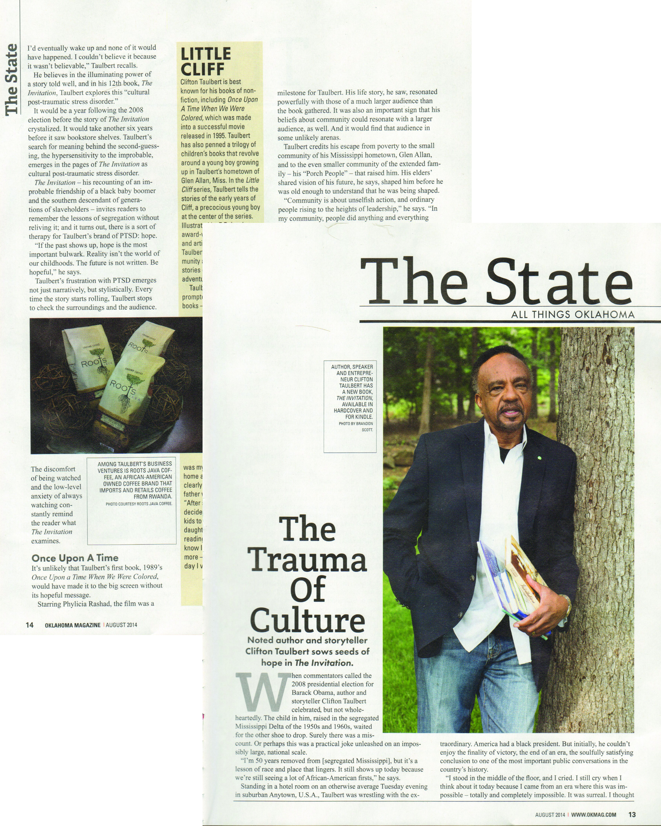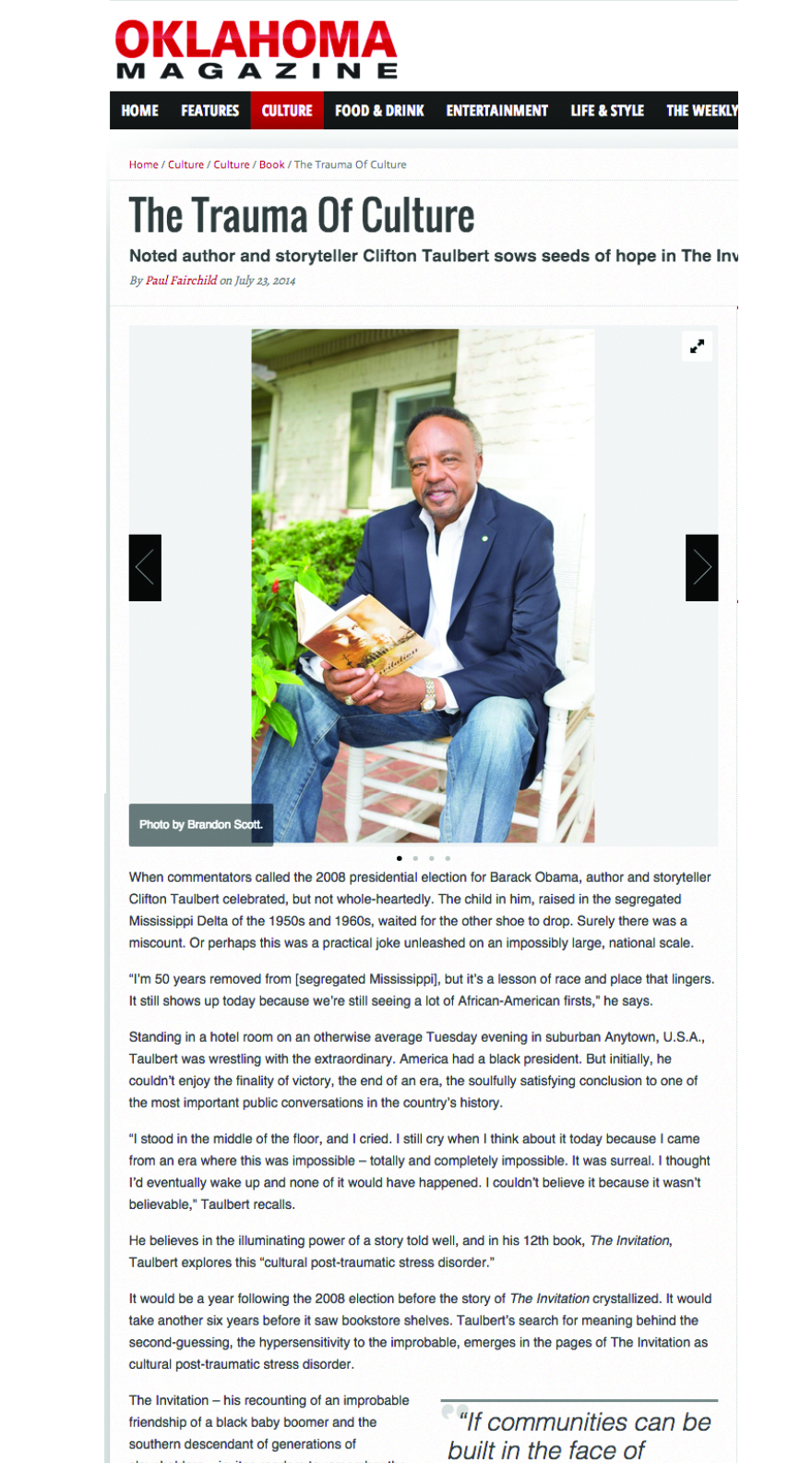 http://www.tulsaworld.com/scene/books/clifton-taulbert-talks-about-story-of-the-invitation-ahead-of/article_63f3fe7f-fe10-5e1c-856f-ffdb8dcf2629.html http://publicradiotulsa.org/post/noted-tulsa-based-author-clifton-taulbert-offers-invitation